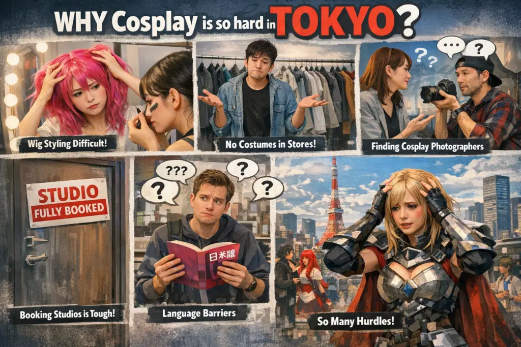 The reasons it's difficult are that cosplay wigs are challenging to create and adjust, and the costumes aren't sold in regular retail stores. Cosplay makeup is specialized compared to regular makeup, making it hard for beginners to achieve a high level of finish. Booking studio time is difficult. Arranging photographers skilled in cosplay photography is also extremely difficult. Furthermore, there are language barriers. Consequently, while cosplay's popularity continues to grow, the hurdles to immediately realizing it upon arriving in Japan are very high.